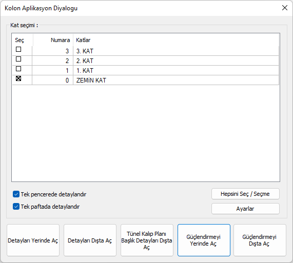 Açılan Kolon Aplikasyon Diyaloğunda aplikasyon planını almak istediğiniz katı ya da katları işaretleyin.