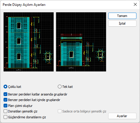 Mantolama elemanlarının ve güçlendirme perdelerinin aplikasyon planlarını almak için;