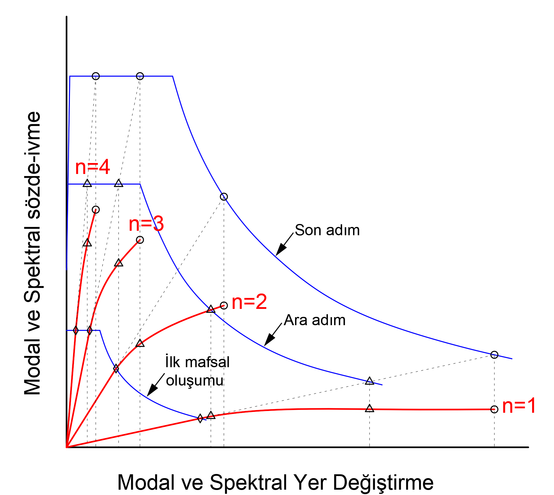 Bu bağıntıda (n) mod sayısını, :art_ölç_kat: ise ( i ) ‘inci adımda bütün modlar için sabit olan artımsal ölçek katsayısını göstermektedir. Sden(1) ilk itme adımında (doğrusal elastik durumda) n’inci moda ait elastik spektral yerdeğiştirmedir. Yöntemin detaylı açıklaması yapılacaktır. Burada her bir mod için modal ölçekleme yapılır ve bu ölçeklemenin esası “eşit yerdeğiştirme kuralı” dır. Bu kuralda nonlineer spektral yerdeğiştirmenin elastik spektral yerdeğiştirmeye eşit olduğu kabul edilmektedir. Aşağıdaki şekilde her bir mod için Modal ve Spektral yedeğiştirmelerin, yatay elastik tasarım spektrumundan elde edilen spektral sözde ivme grafiklerinin her bir itme adımında ölçeklenmesinin temsili bir grafiği gösterilmiştir.