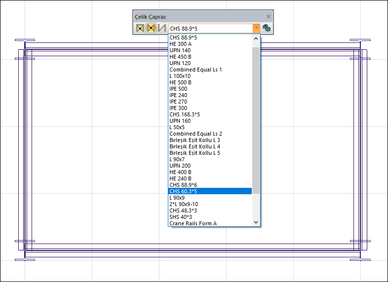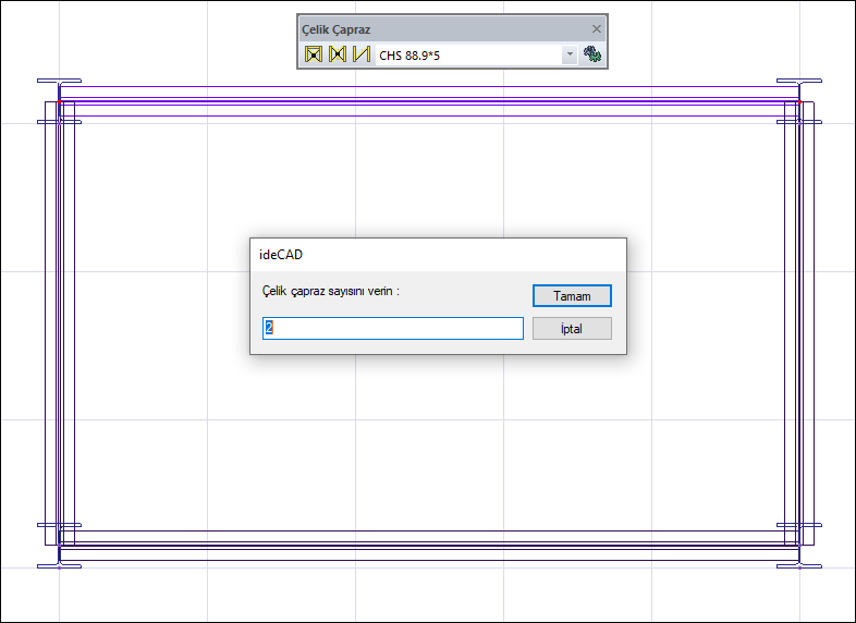 Fare imlecini çapraz tanımlamak istediğiniz iki kirişi seçin. Açılan pencerede çapraz adedini girin. Tamam butonuna tıklayın.
