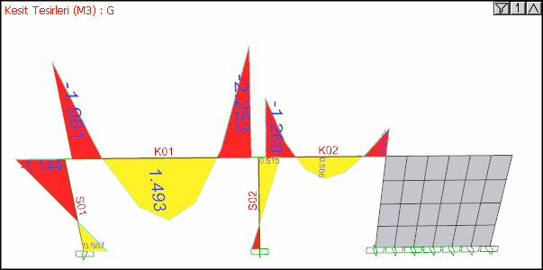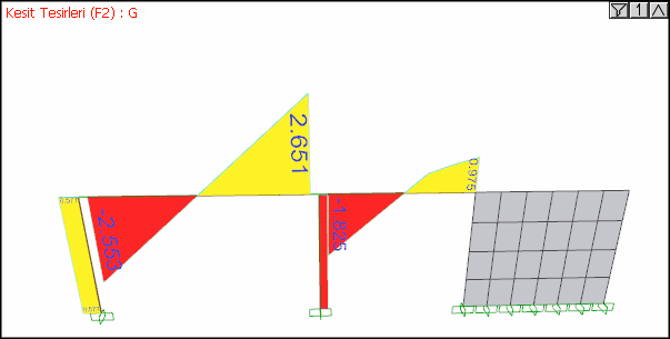 | Bileşen  Çubuk elemanlarda oluşan normal kuvvet, kesme kuvveti ve moment değerleri eleman lokal akslarında seçilen herhangi bir kombinasyon için gösterilir. Daha anlaşır olması için örnek ekran görüntüleri tek çerçeve tek kat olarak düzenlenmiştir. Düşey Yükler Moment Diyagramı 3-3 Örneği  Düşey Yükler Kesme Kuvveti 2-2 Diyagramı Örneği  Düşey Yükler Eksenel Kuvvet Diyagramı Örneği  Deprem Yüklemesi Eksenel Kuvvet Diyagramı Örneği  |