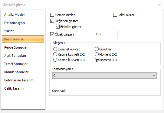 | Ölçek çarpanı  Seçenek işaretli değilse iç kuvvet diyagramları için programın uygun gördüğü ölçek çarpanı uygulanır. İşaretlenirse sağında yer alan kutucuğa istenilen ölçek çarpanı değeri elle girilebilir. |