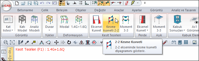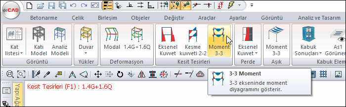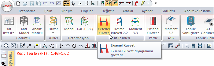 Ribbon menü Analiz ve Tasarım Görüntüleme sekmesi Kesit Tesirleri başlığı altından eksenel kuvvet, kesme kuvveti ve moment komutlarından birine tıklayarak Kesit Tesirleri sekmesinden ulaşabilirsiniz.