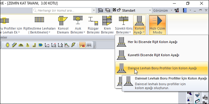 Çelik menüsünden Dairesel Levhalı Boru Profiller İçin Kolon Ayağı satırını tıklayın.