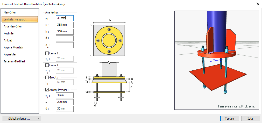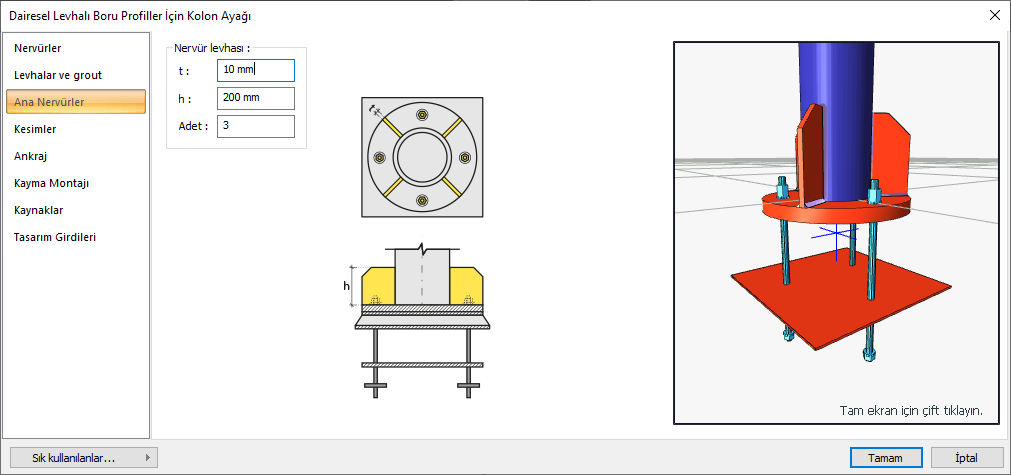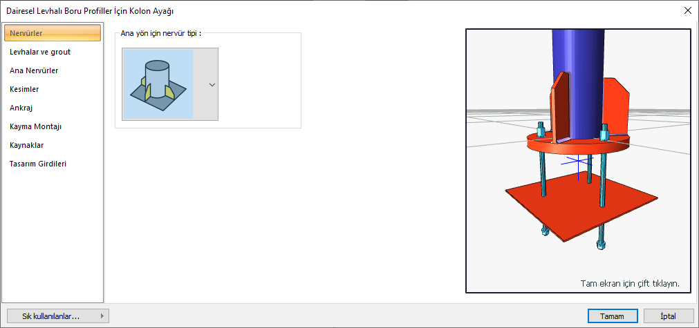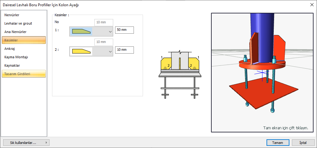 Dairesel Levhalı Boru Profiller İçin Kolon Ayağı Tanımlama