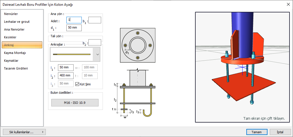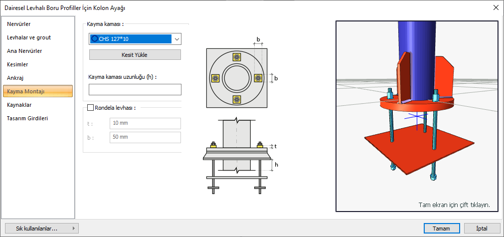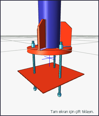 Dairesel Levhalı Boru Profiller için Kolon Ayağı komutu ile çelik kolon-temel birleşimi tanımlanır.