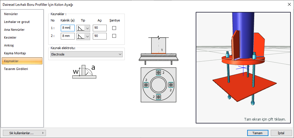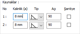 Kaynaklar ![]() Birleşim yerlerine yapılacak kaynakların kalınlık, tip ve açı değerleri verilir. Şantiyede yapılıp yapılmayacağı bilgisi girilir. |