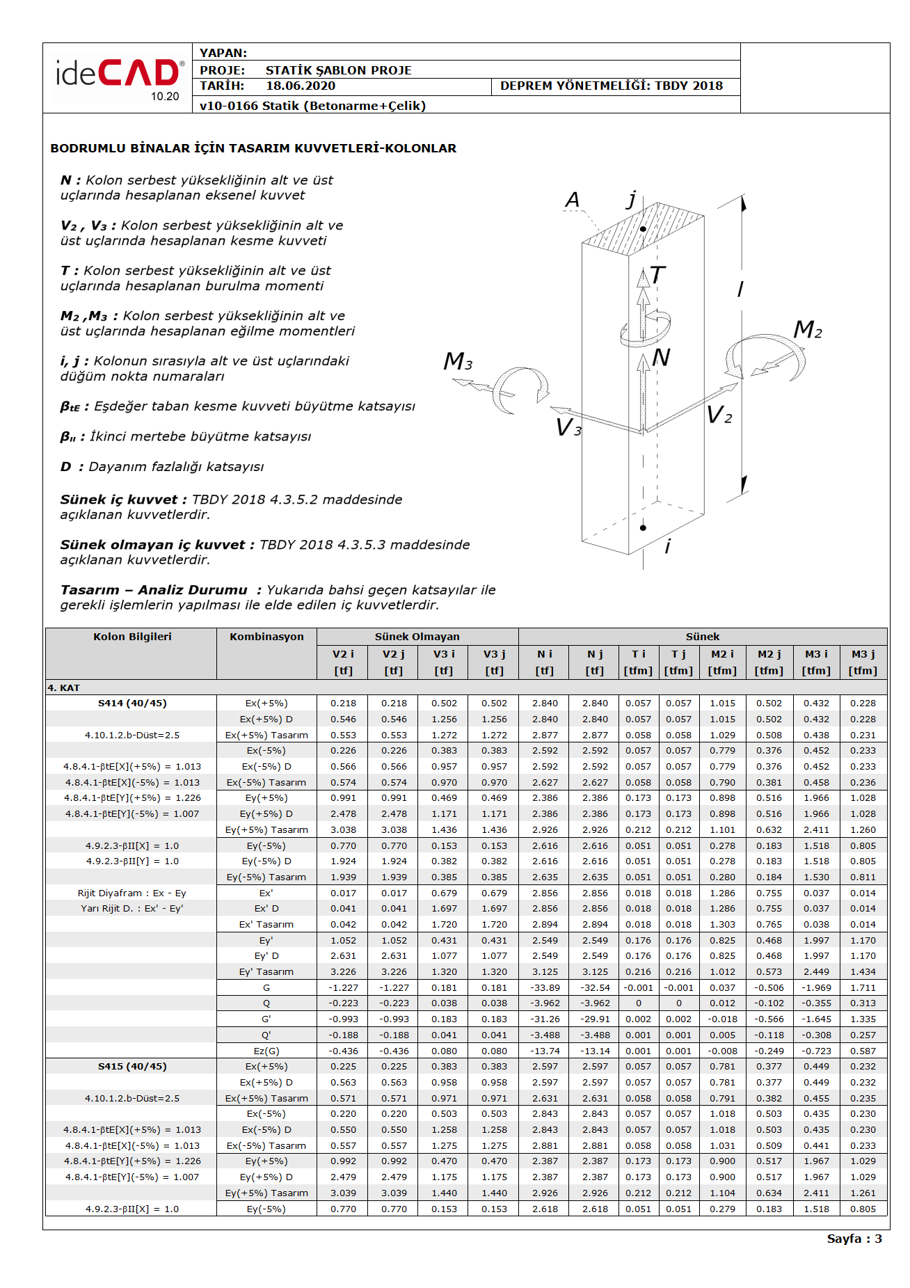 Bütün elemanların tasarım kuvvetleri raporunda Dayanım Fazlalığı Katsayısı D 'nin uygulandığı durumlar görülebilir. Aşağıdaki örnek bir kolon raporunda Dayanım Fazlalığı Katsayısı D 'nin hangi kuvvetlerde uygulandığı açıkça görülmektedir.