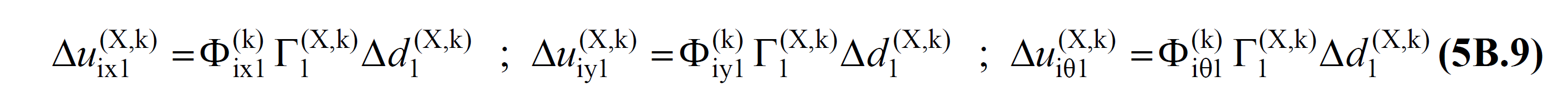 5B.2.2 – Her bir k’ıncı itme adımında, yukarıda Denk.(5B.7) ’de verilen kat deprem yükü artımları ’nın etkisi altında meydana gelen kat yerdeğiştirme artımları Denk.(5B.9) ile elde edilir: