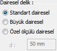 Dairesel delik ![]() Standart, büyük ya da özel ölçülü dairesel delik tiplerinden biri seçilir. Özel ölçülü dairesel tipi seçilirse istenilen değer verilebilir. |