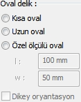 Oval delik ![]() Kısa, uzun ya da özel ölçülü oval delik tiplerinden biri seçilir. Özel ölçülü oval tipi seçilirse istenilen değer verilebilir. |