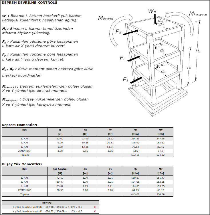 Ara değerler ve kontrol sonuçları Deprem Devrilme Kontrolü raporunda verilmektedir.
