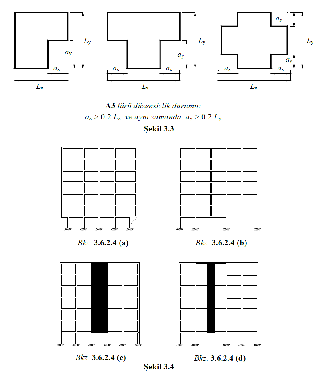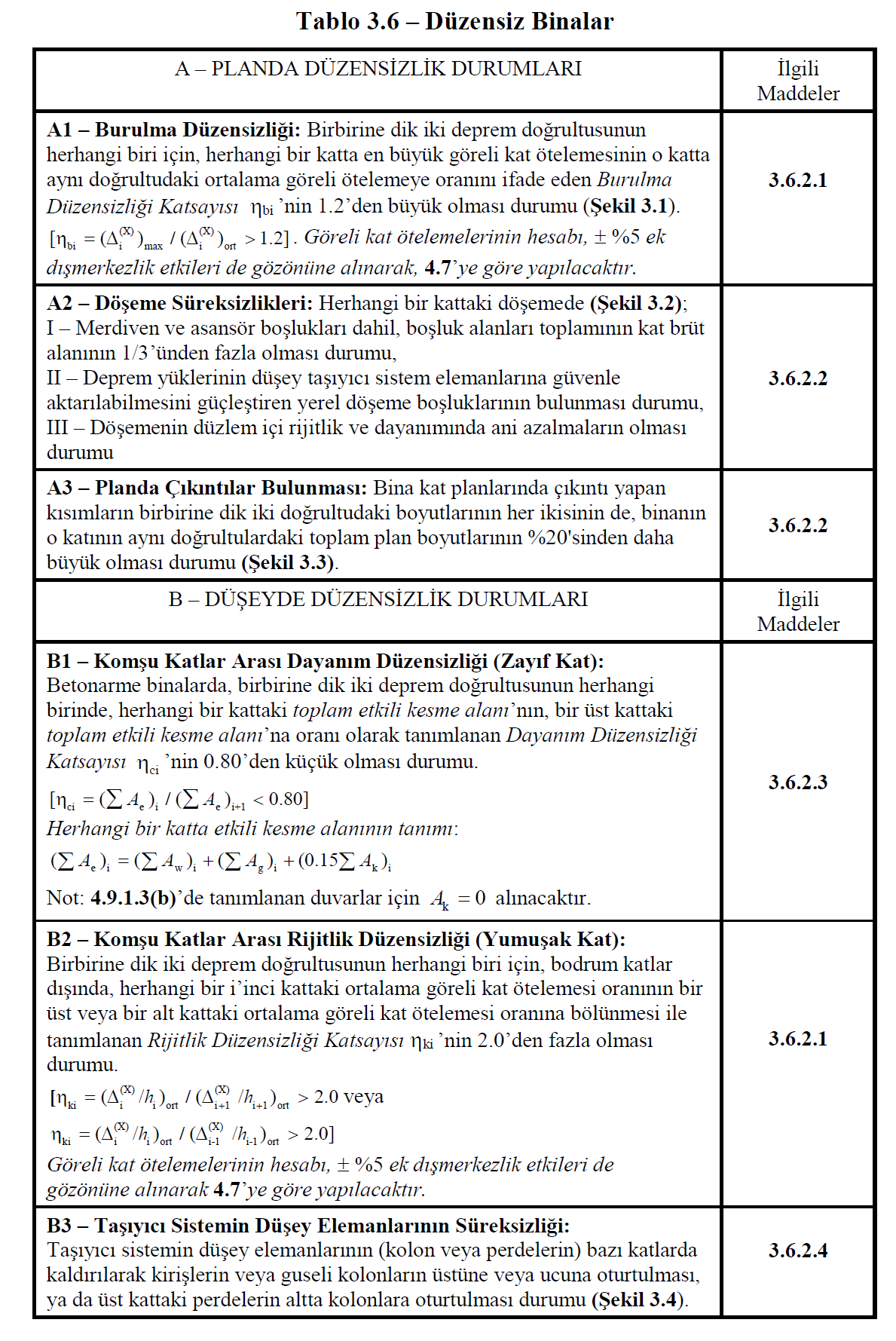 Depreme karşı davranışlarındaki olumsuzluklar nedeni ile tasarımından ve yapımından kaçınılması gereken düzensiz binalar’ın tanımlanması ile ilgili olarak, planda ve düşey doğrultuda düzensizlik meydana getiren durumlar Tablo 3.6 ’da, bunlarla ilgili koşullar ise 3.6.2 ’de verilmiştir.