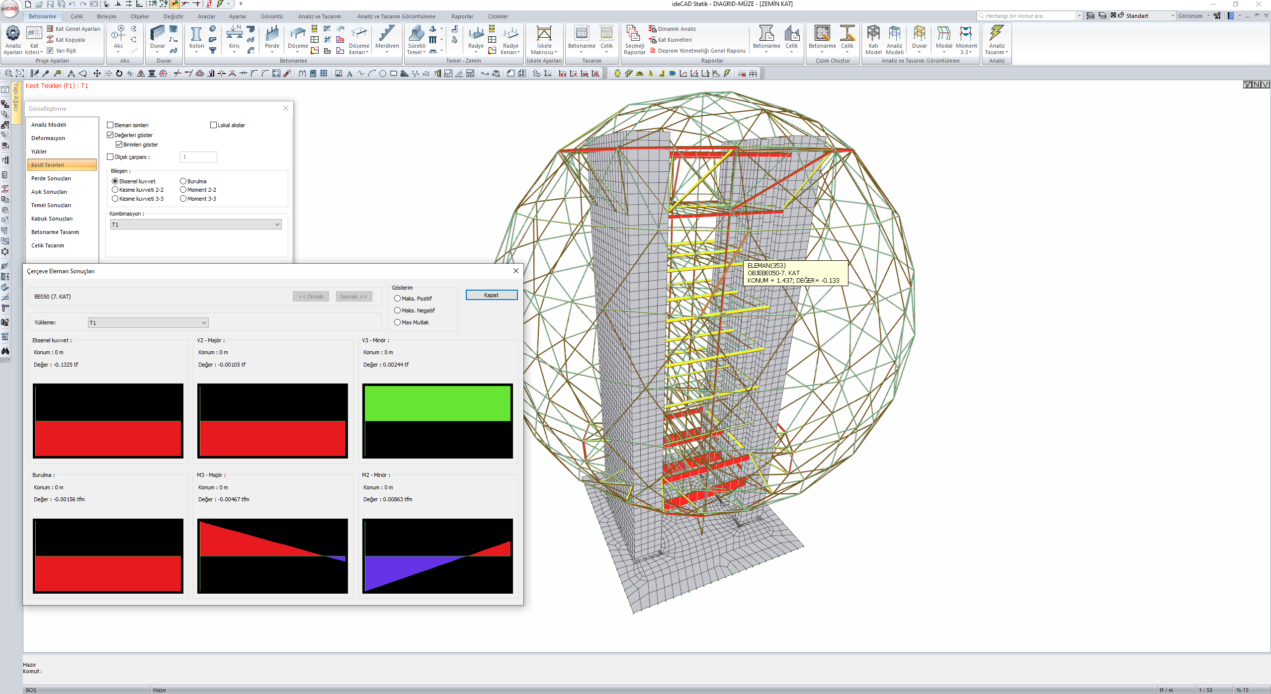 Düşey yükler, toprak itkisi, sıcaklık farkı dahil olmak üzere bütün yükleme durumlarında üç boyutlu analiz modeli otomatik oluşturulur.