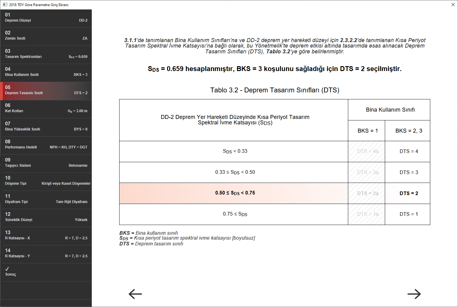 TBDY 2018 Tablo 3.2’ye göre ideCAD Statik Deprem Tasarım Sınıfı(DTS) 'yi otomatik olarak seçer. Deprem tasarım sınıfı seçiminde DD-2 deprem yer hareketi düzeyine göre hesaplanan SDS ve bina kullanım sınıfı göz önüne alınır.