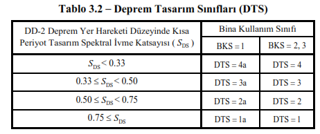 TBDY 2018’de deprem tasarım sınıfı Tablo 3.2’de belirlenir.