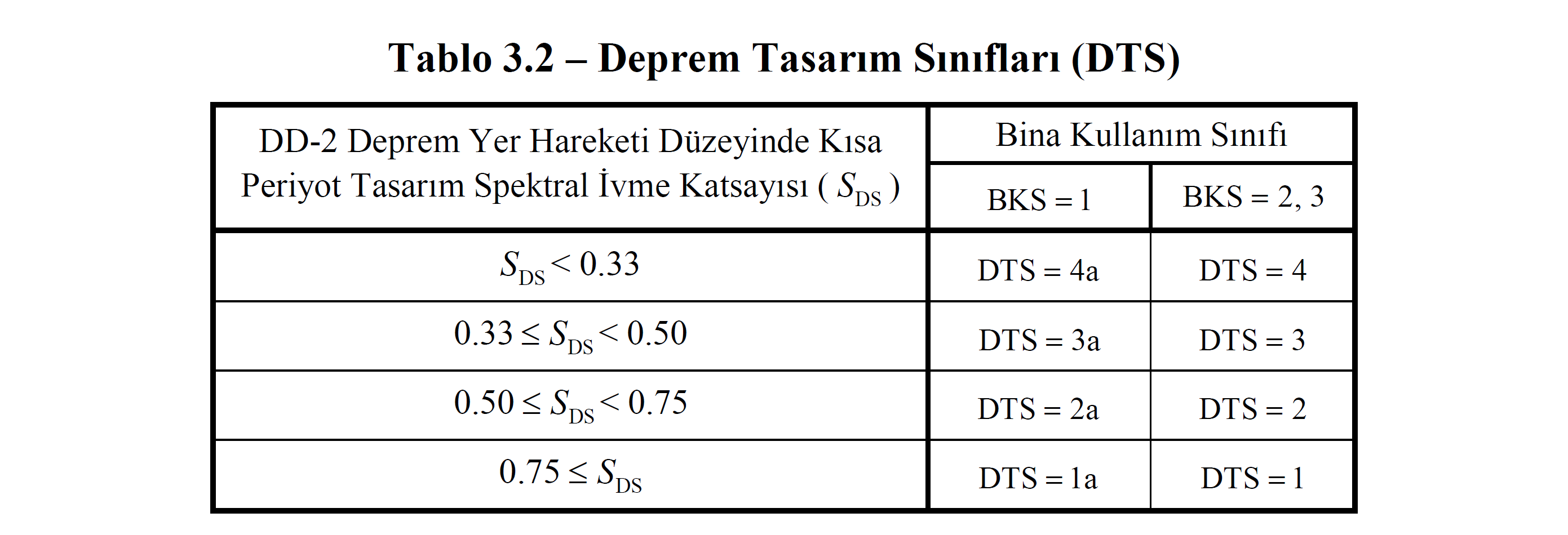 Dayanıma Göre Tasarım (DGT) yaklaşımı uygulanırken, TBDY Madde 3.2 'ye uygun olarak Bina Kullanım Sınıfları (BKS) ve DD-2 için 2.3.2.2 'de tanımlanan kısa periyot tasarım spektral ivme katsayısı, SDS parametrelerine esas alınarak Tablo 3.2 'ye göre Deprem Tasarım Sınıfı (DTS) belirlenir.