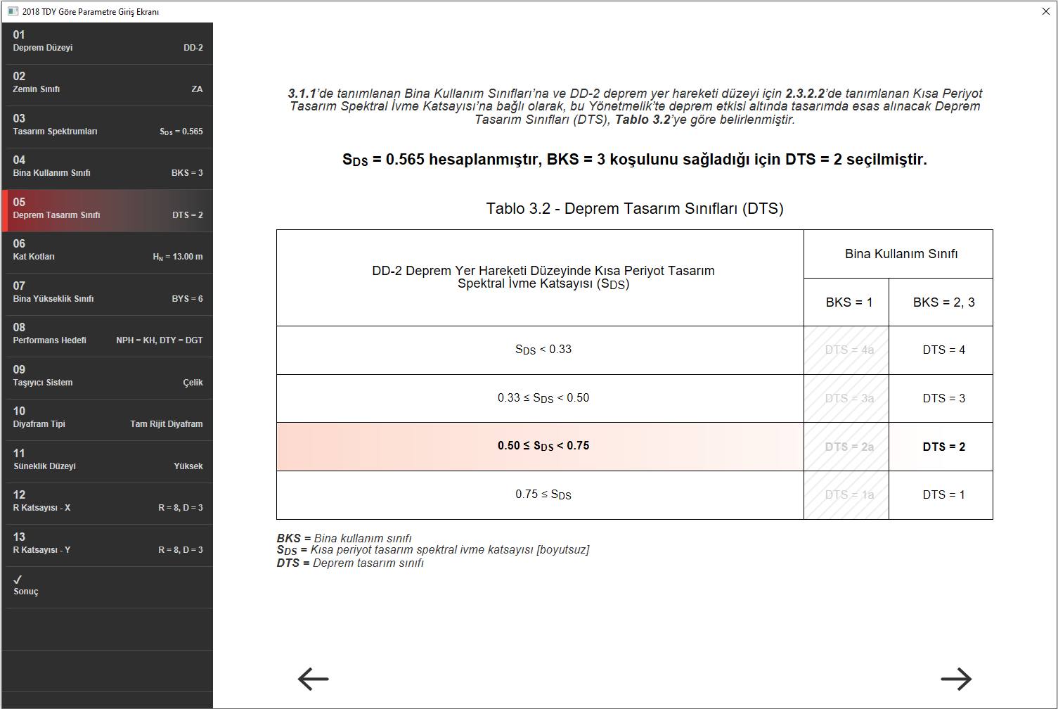 TBDY 2018 Tablo 3.2’de DD-2 deprem düzeyi için kısa periyod tasarım spektral ivme katsayısı SDS ve Bina Kullanım Sınıfına göre Deprem Tasarım Sınıfı belirlenir.