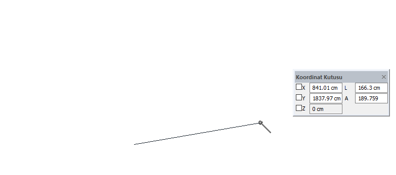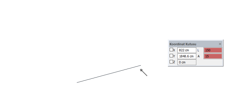 Fareyi sürükleyin ve sol tuşu tıklayarak çizginin bitiş noktasını belirleyin. Noktayı tıklamadan önce klavyeden A tuşuna basarak koordinat kutusundan çizginin eğimini, L tuşuna basarak da çizginin uzunluğunu girebilirsiniz.