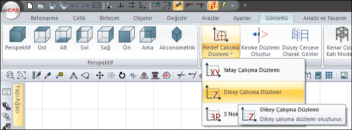 Ribbon menüde Görüntü sekmesi Çalışma Düzlemi başlığından Dikey Çalışma Düzlemi ikonunu tıklayın.