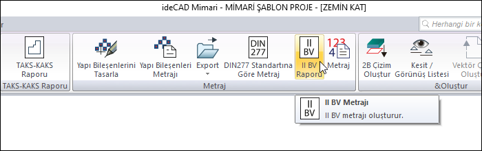 ideCAD’de DIN277 ve II BV standartlarına göre metraj oluşturulur.