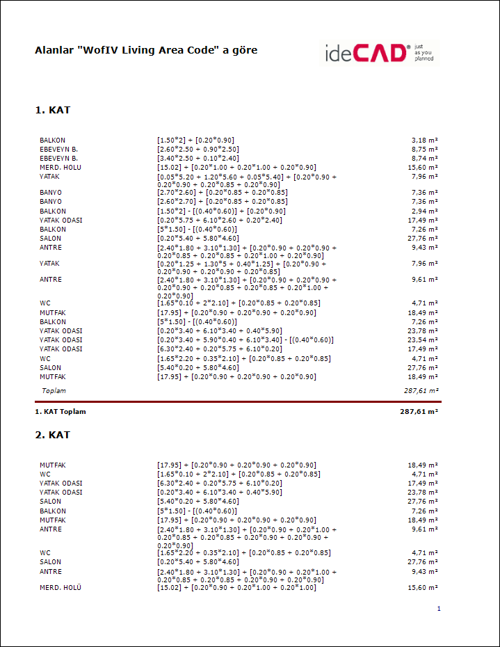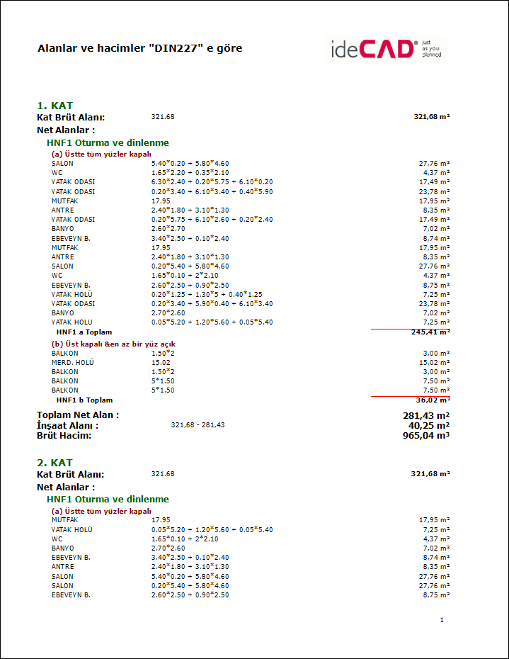 Örnek DIN277 standardına göre metraj raporu sayfası ![]() |