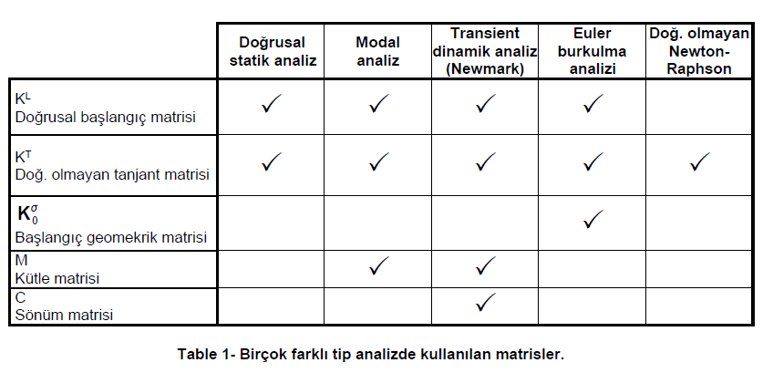 Not: Doğrusal olmayan modeller ve statik, modal, transient dinamik ya da burkulma analizlerinde kullanıcı tarafından başlangıç yer değiştirme durumu girdisi tanımlanmışsa, doğrusal başlangıç rijitliği yerine doğrusal olmayan tanjant rijitlik kullanılır. Bu, başlangıç durumu sebebiyle olan doğrusal olmayan terimler dikkate alınarak doğrusal bir analiz (statik, modal ya da burkulma) yapılmasını mümkün kılar.