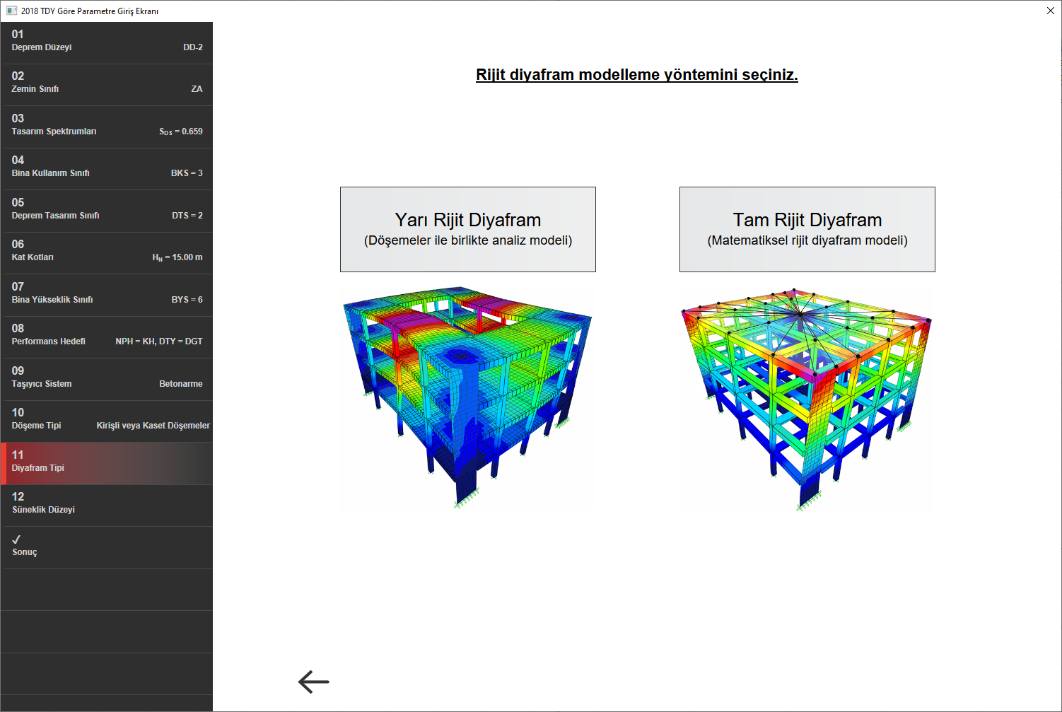Döşeme analiz modelinde Tam rijit diyafram veya yarı rijit diyafram kabulü diyafram tipi adımında belirlenir.