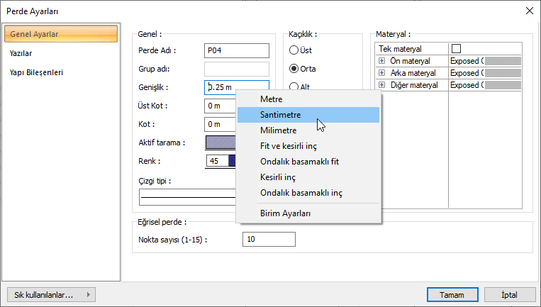 ideCAD’de birim ayarları, Genel Ayalar diyaloğu Girdi Birimleri sekmesinden yapılmaktadır. Ayrıca herhangi bir diyalog içerisinde, yazı kutusu üzerinde farenin sağ tuşu tıklanarak birim listesi açılır. Herhangi bir anda çalışma birimi değiştirilebilir.