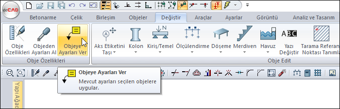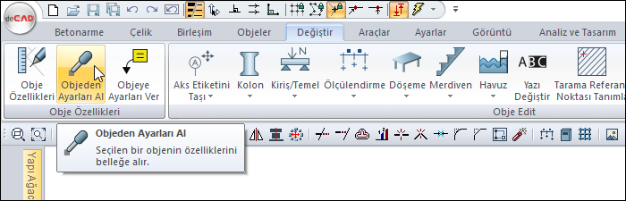 Objeden Ayarları Al komutu, daha önceden çizilmiş bir objenin ayarlarını kopyalar. Objeden Ayarları Al komutu kullanıldıktan sonra, yeni çizilecek elemanın özellikleri ayarı baz alınan eleman ile aynı olacaktır.