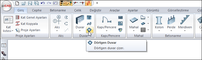 Ribbon menü Betonarme sekmesi Duvar başlığı altında yer alan Duvar komutuna girdikten sonra açılan Duvar toolbarından ulaşabilirsiniz.