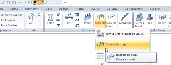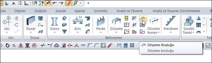 Döşeme Boşluğu komutu ile mevcut betonarme döşemeler üzerinde boşluk açılır.