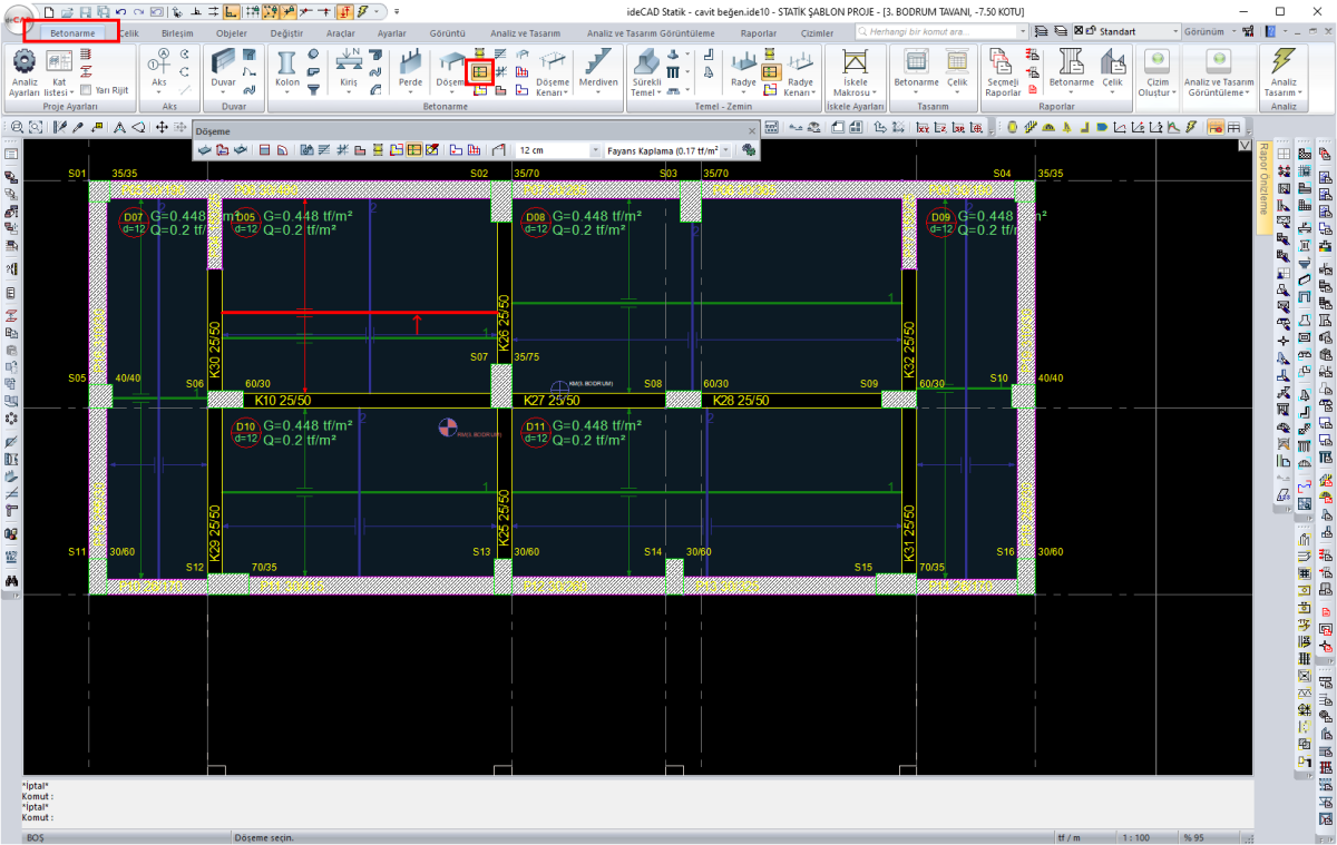 Döşeme tanımlandığında, yatay ve dikey yönde döşeme ortasını baz alarak iki tane döşeme hesap aksı tanımlar. Döşemelerin “Betonarme / Döşeme / Döşeme Hesap Aksı Geometrisini Değiştir” komutu ile çizilen bir hesap aksının konumu veya çalışma mesafesi değiştirilir.