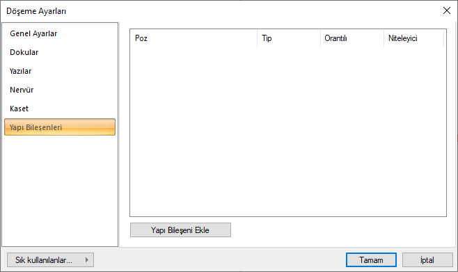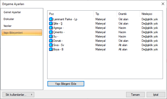 İlgili obje ayarları yapı bileşeni sekmelerinde malzeme ölçüsüne göre açılan liste ve açıklamaları verilmiştir.