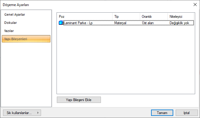 Örneğin laminant parke kaplı bir döşemenin yapı bileşenleri metrajını almak için ilk olarak yapı bileşenlerinin döşemeye atanması gerekmektedir. Döşemeye atanacak yapı bileşenleri;