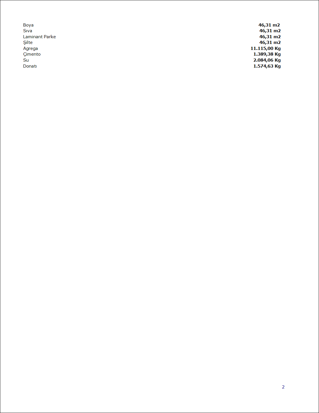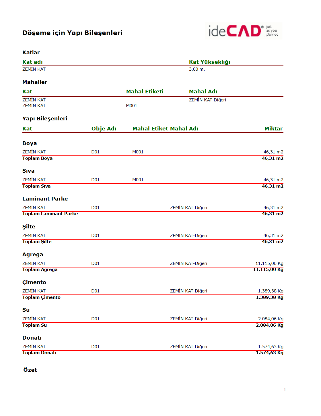Döşeme için örnek yapı bileşeni metraj raporu ![]() ![]() |