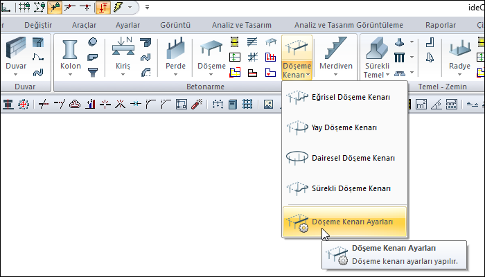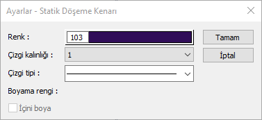 Döşeme Kenarı Ayarları komutuyla döşeme kenarı ayarlarına ulaşılır. Ayarlar-statik döşeme kenarı diyaloğunda kullanıcı tarafından değiştirilebilir parametreler mevcuttur.