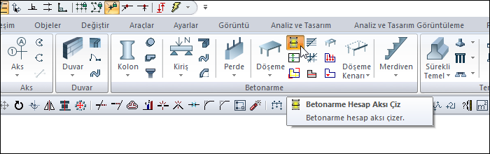 - Döşemeleri oluşturulduktan sonra Betonarme Hesap Aksı Çiz ikonunu tıklayın.