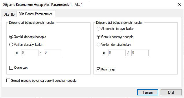 | Geçerli mesafe boyunca gerekli donatıyı hesapla  İşaretlenirse, donatı aksının geçerli olduğu mesafe içinde kalan bölgede maksimum momenti karşılayacak şekilde donatı hesabı yapılır. İşaretlenmezse sadece donatı aksı üzerindeki momenti karşılayacak donatı hesabı yapılır. |