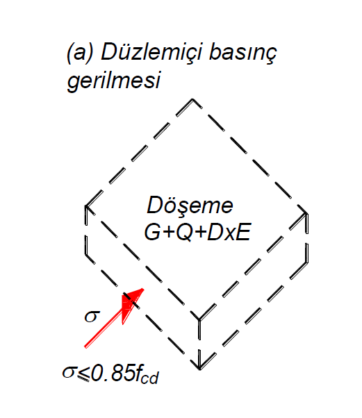 TBDY Madde 7.11.3 'e göre döşeme düzlemi içinde basınç ezilmesini önlemek için düşey yükler ve Dayanım Fazlalığı Katsayısı D dikkate alınarak hesaplanan deprem yüklerinin ortak etkisi altında hesaplanan basınç gerilmesinin 0.85fcd sınırını aşmaması gerekir. fcd, betonun tasarım basınç dayanımıdır. Aşağıdaki resimde döşeme düzlem içi basınç gerilmesinin temsili bir kabuk sonlu elemanda tek bir yön için hangi düzlemde olduğu gözükmektedir. Bu gerilmeler sonlu elemanın tüm yüzeylerinde hesaplanmaktadır.