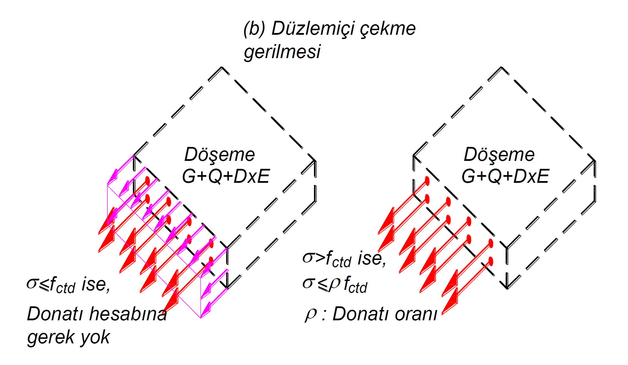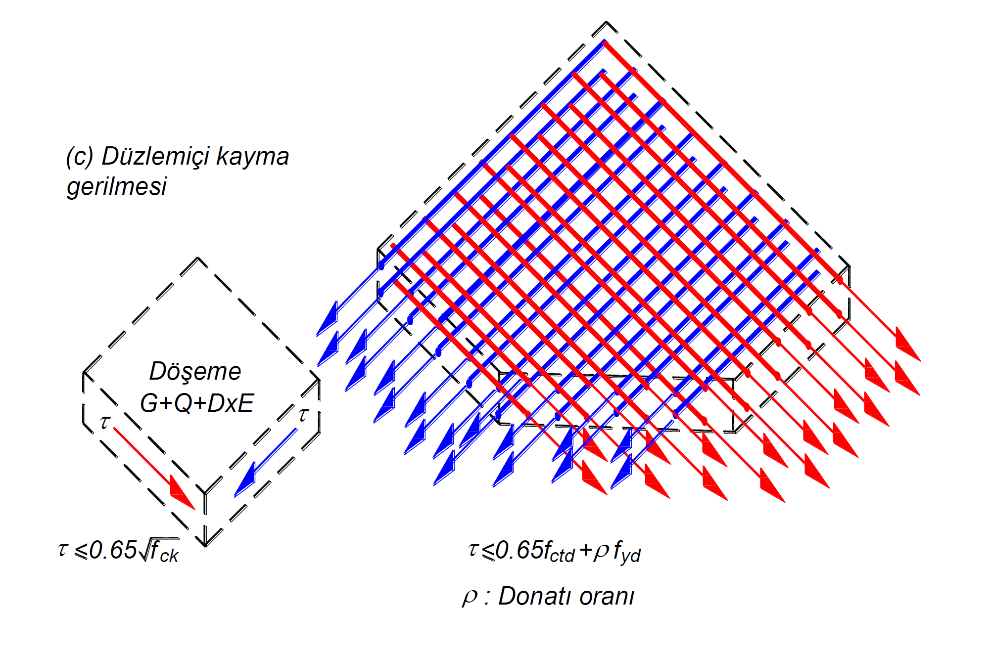 olarak verilmiştir. Bu denklemde fctd, betonun tasarım çekme dayanımı ve fyd, döşeme donatısının tasarım akma gerilmesi anlamına gelmektedir. Aynı zamanda, ρ kayma gerilmesine paralel olan eğilme için gerekli olmayan donatının döşeme kesitine oranıdır. Bu suretle kayma gerilmelerinden oluşan eğik çekme gerilmelerinin donatı ile karşılanması hedeflenir. Bu donatının durumu, kiriş kesitlerindeki kesme kuvvetine paralel olan etriyeye veya perdede kesme kuvvetini karşılayan yatay gövde donatısına benzetilebilir. Düzlem içi oluşan kayma gerilmelerinin üst sınırı, betonun ezilmesinin önlenmesi için 0.65(fck)1/2 değeri öngörülmüştür. Aşağıdaki resimde düşey yükler ve Dayanım Fazlalığı Katsayısı D dikkate alınarak hesaplanan deprem yüklerinin ortak tkisi altında hesaplanan düzlem içi kayma gerilmeleri temsili bir sonlu elemanda gösterilmiştir. Kırmızı ok ile gösterilmiş kayma gerilmesini, yine bu gerilme yönüne paralel olan donatılar tarafından karşılanacağı kırmızı oklar ile gösterilmiştir. Benzer bir durum mavi gerilme için de geçerlidir.