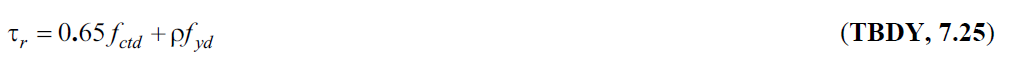doğrultuda yerleştirilecek olan döşeme donatısı oranı, fyd döşeme donatısının tasarım akma gerilmesi ve fctd betonun tasarım çekme dayanımı olmak üzere döşeme düzlem içindeki yatay kayma gerilmesi TBDY Denklem 7.25 ile verilen sınır değeri aşmayacaktır.