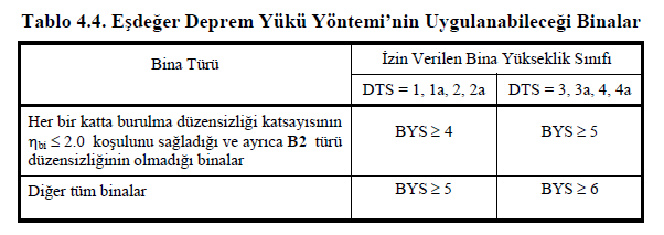 4.6.2.2 – Ayrıntıları 4.7’de açıklanan Eşdeğer Deprem Yükü Yöntemi’nin uygulanabileceği binalar Tablo 4.4’te verilmiştir.