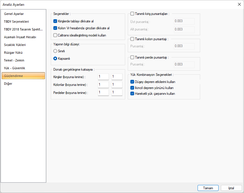 Bina performansı belirlenirken TBDY 2018 Denklem 5.1 ‘de açıklanan yük birleşimini oluşturabilmek için yukarıda bahsedilen üç seçeneğin de işaretli olması gerekmektedir.