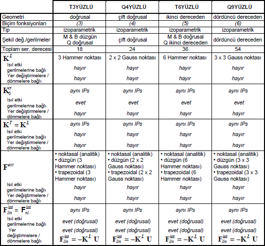 Bu elemanlarda membran rijitliği (düzlem içi), eğilme ve enine-kayma rijitliği (düzlem dışı) bulunmaktadır. Küçük-şekil değiştirme/küçük-yer değiştirme esaslı Reissner-Mindlin kabuk teorisini (doğrusal teori)17 temel almaktadır. Bu teoride, kalınlık boyunca malzeme çizgileri sadece dönme yaparak şekil değiştirme yapmadan düz kalmakta ve enine kayma-şekil değiştirmesine izin verilmektedir (yüzeye dik malzeme çizgileri ile ortalama orta-yüzey arasındaki açı değişebilmektedir).