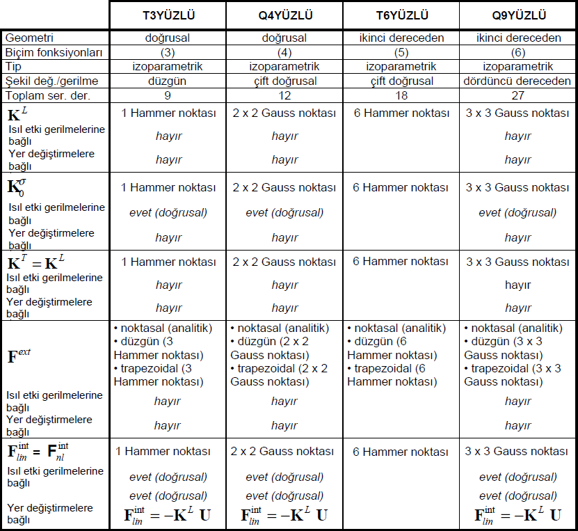 Bu elemanların kalınlıkları düzgün yayılıdır (incelen kesit yoktur ancak kalınlık bir elemandan diğerine geçerken değişebilir). Elemanların aynı düzlemde olmasına gerek yoktur (eğrisel sonlu elemanlar ağı kullanılabilir ayrıca T6 ve Q9 gibi ikinci dereceden elemanlar da eğrisel olabilirler).