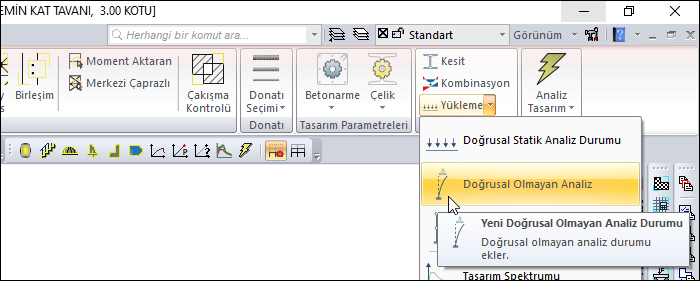 Yapı ağacında bulunan Doğrusal Olmayan Analiz başlığı altında Geometri Bakımından Doğrusal Olmayan Statik Analiz Durumu tanımlanabilir. Doğrusal Olmayan Analiz başlığı altında bulunan statik analiz durumları yalnızca ikinci mertebe etkilerinin göz önüne alındığı analiz durumunu gösterir.