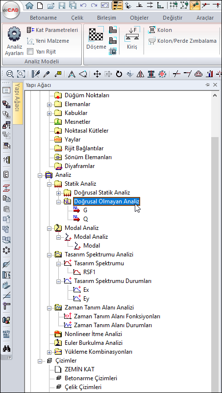 Doğrusal olmayan analiz ve yükleme durumları yapı ağacında Analiz klasörü altında gösterilir.