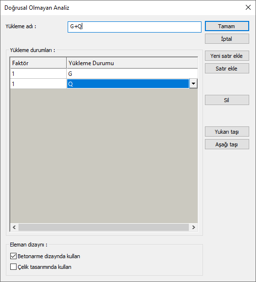 Yükleme Adı satırında tanımlanan yükleme durumu ve faktör değerlerine göre otomatik olarak yükleme adı yazılacaktır. İsteğe bağlı olarak bu yükleme adı değiştirilebilir.