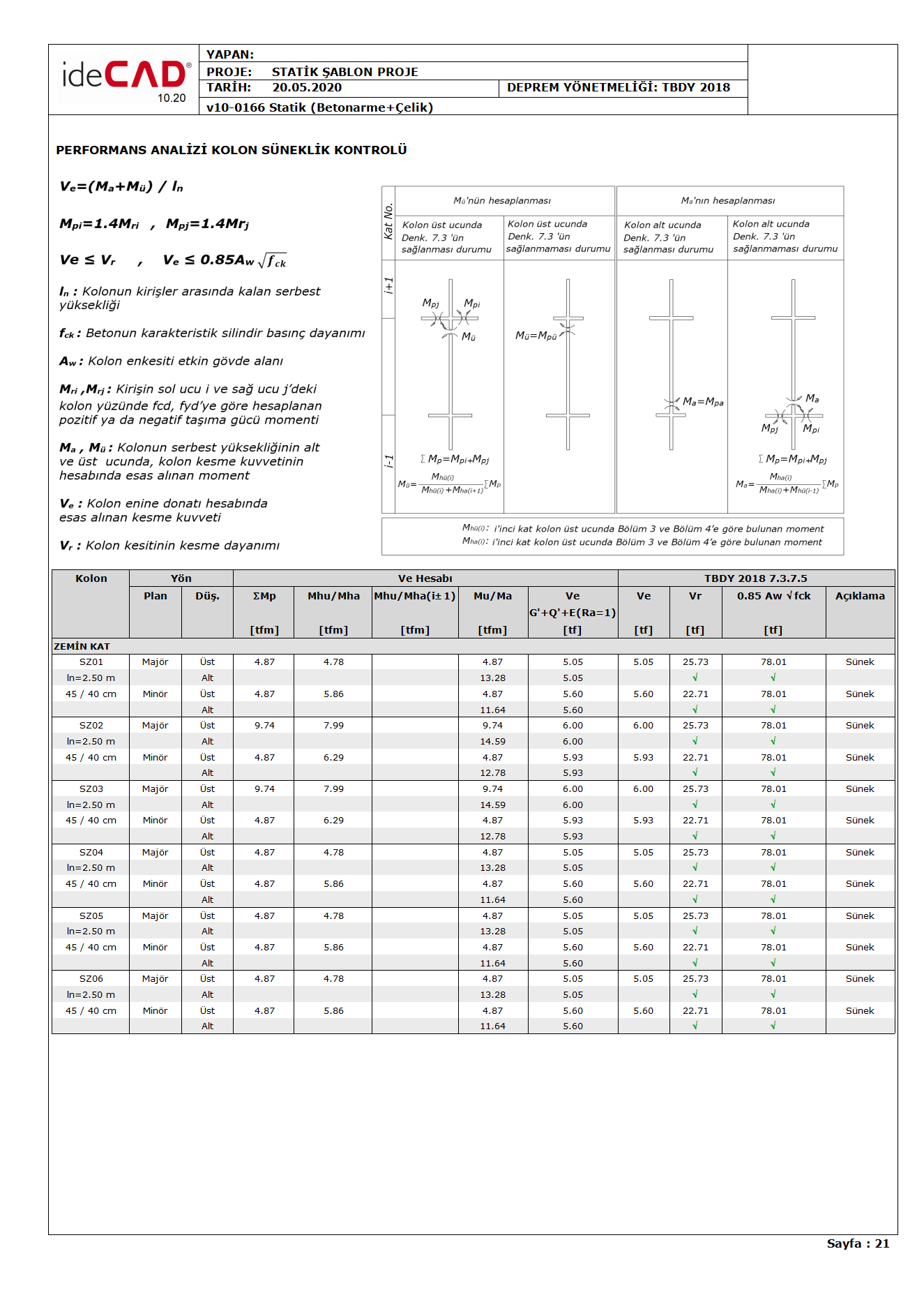Kolonlar için Ve hesabı TBDY 7.3.7 'de belirtilen Kolonların Kesme Güvenliği koşullarına göre yapılmaktadır. Bu durumda kolonlar için tasarım kesme kuvveti olan Ve değeri Denk.(7.5) ile hesaplanmaktadır. TBDY 7.3.7 'ye göre hesaplanan Ve değeri Denk.(7.10) 'daki koşulları sağlıyor ise sünek kolon, sağlamıyor ise gevrek kolon olarak sınıflandırılır. Ma ve Mü sırasıyla kolonun sertbest yüksekliğinin alt ve üst ucunda, kolon kesme kuvvetinin hesabında esas alınan moment değeridir. Kolonlar için Ve, Ma ve Mü hesabının detaylı açıklaması Kolonların Kesme Güvenliği Kontrolü başlığında anlatılmıştır. Ancak Ma ve Mü momentleri hesaplanırken kullanılan moment kapasitesi değerleri pekleşme gözönüne alınmadan yapılır.